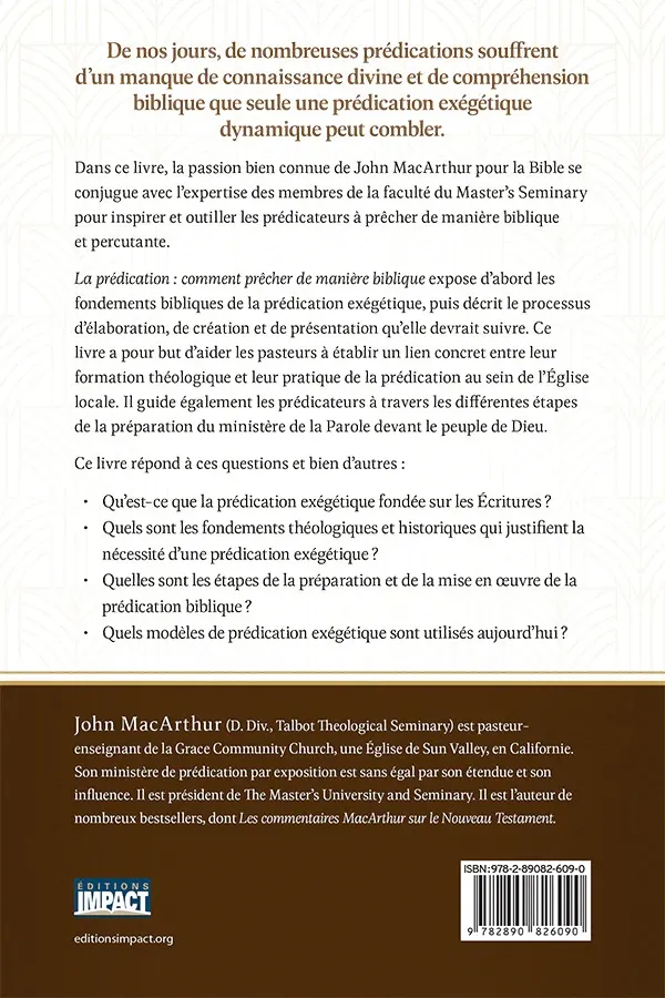 L’ouvrage explore les fondements bibliques, théologiques et historiques de cette approche, tout en détaillant les étapes pratiques de préparation et de proclamation. Il vise à renforcer le lien entre la formation théologique et le ministère pastoral dans l’Église locale, en offrant à la fois des principes clairs et des exemples concrets.