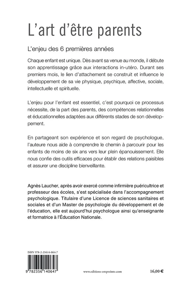 L’auteure, forte de son expérience de psychologue, explique les compétences relationnelles nécessaires aux parents à chaque étape, de la naissance à six ans. Elle propose des outils simples pour favoriser un climat familial serein et une discipline bienveillante, contribuant ainsi au plein épanouissement de l’enfant.
