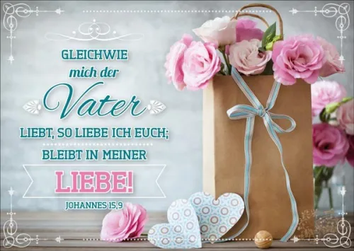 12 gleiche Postkarten mit Bibeltext und Blumenmotiv Format 14,8 cm x 10,5 cm Blumenmotiv Bibeltext aus Johannes 15,9: Gleichwie mich der Vater liebt, so liebe ich euch; Bleibt in meiner Liebe!