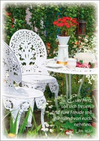 Postkarte mit weissen Stühlen - Gärten Postkarte mit Bibeltext 12 gleiche Postkarten Format 14,8 cm x 10,5 cm passendes Bibelwort aus Johannes 16,22
