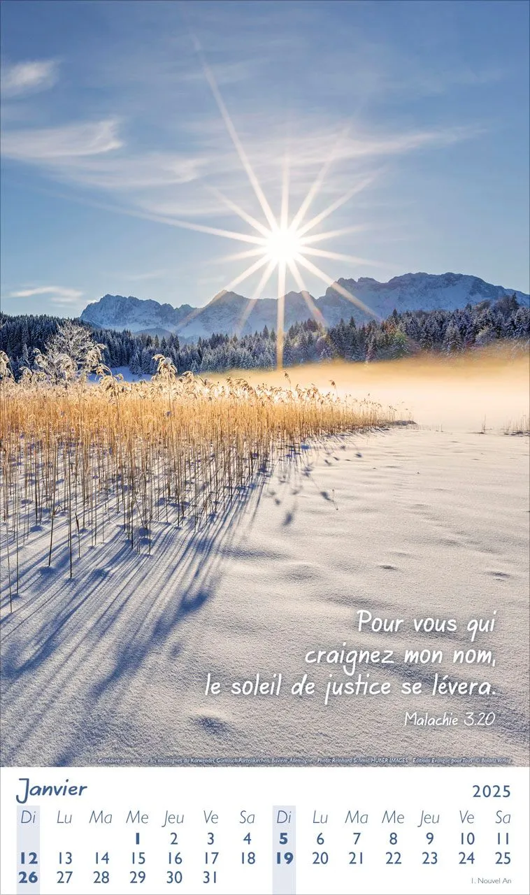 Calendrier avec 12 posters format A3. Magnifiques vues de la Nature qui mettent en valeur la Création. Avec versets bibliques et spirale. Emballage individuel solide.